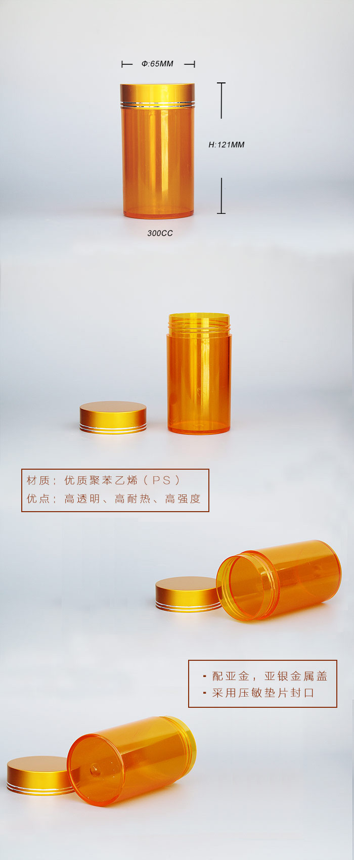 300ccPS高(gao)透塑料瓶容量:300cc。